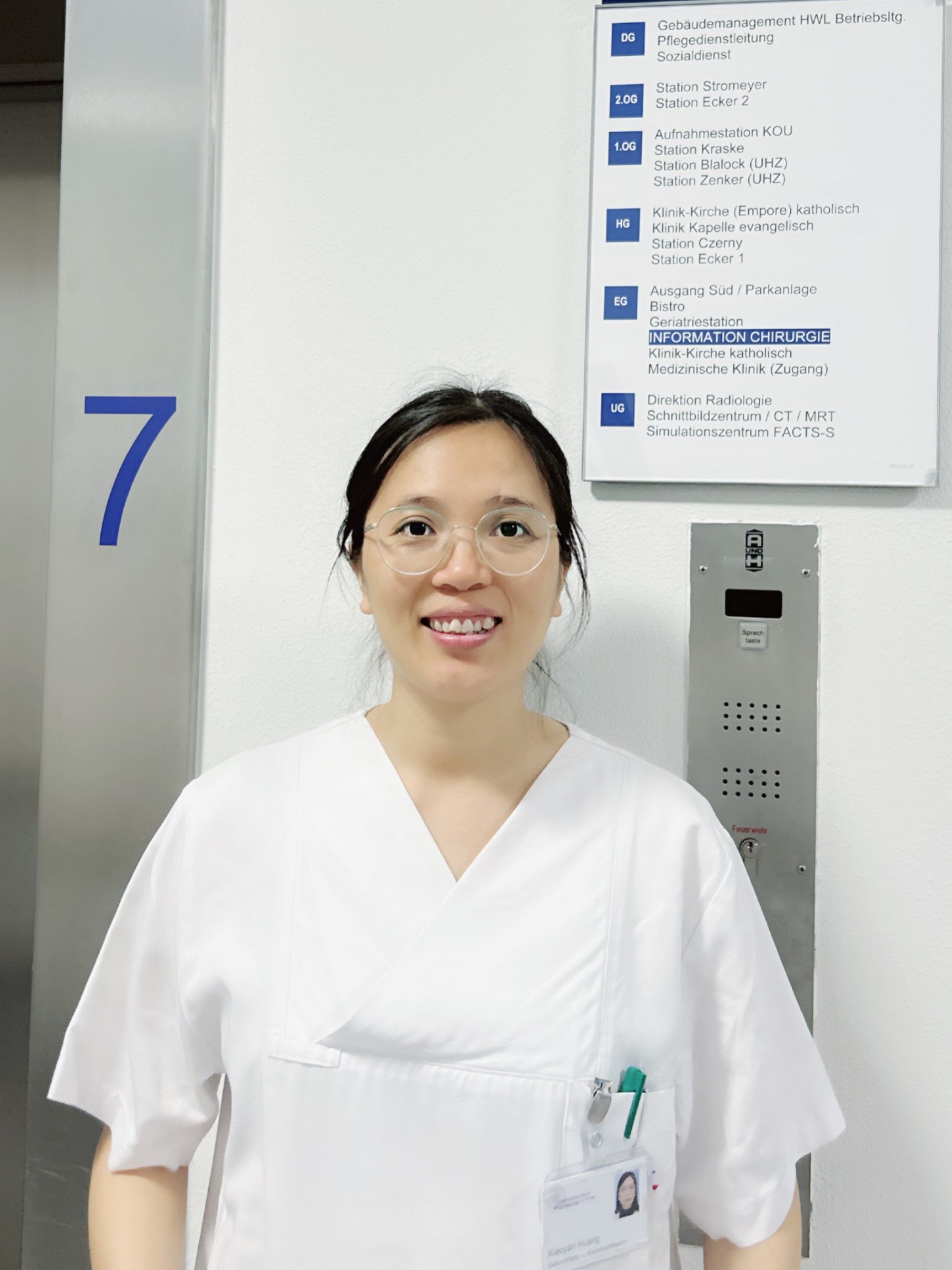 - 在中国,她曾在大型三甲医院积累多年丰富的临床护理经验。目前,她就职于弗莱堡大学医院老年科病区。此前,她曾在海德堡大学医院老年医学中心工作,在老年护理与康复领域拥有多年临床经验。